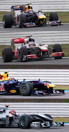 Since the previous season’s Australian GP, I started to notice that the front wings on the Red Bull cars appeared to bend, sometimes even touching the ground and creating sparks. Estimates suggested that the front-wing endplates were deflecting by up to 24 mm. This was later confirmed when McLaren urged an investigation of Red Bull’s front wings and the FIA changed the wing deflection test from a 50 kg load with 10 mm deflection allowed, to a larger 100 kg load with 20 mm permitted.